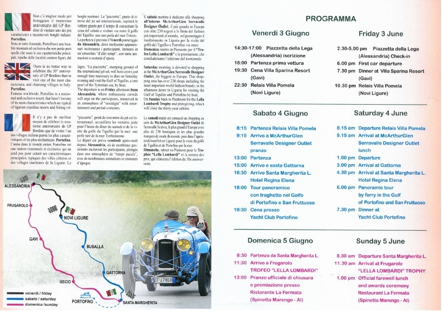 Domenica 5 Giugno, dalle ore 11.30 alle ore 13.00, le autovetture provenienti da Santa Margherita Ligure sosteranno a Frugarolo nella zona fra Via Gramsci e via Cavour, per poi iniziare una gara speciale a cronometro che partirà proprio dalla casa dove ha vissuto la nostra Lella e terminerà dopo aver percorso strada Mandrino alla cascina Belvedere.