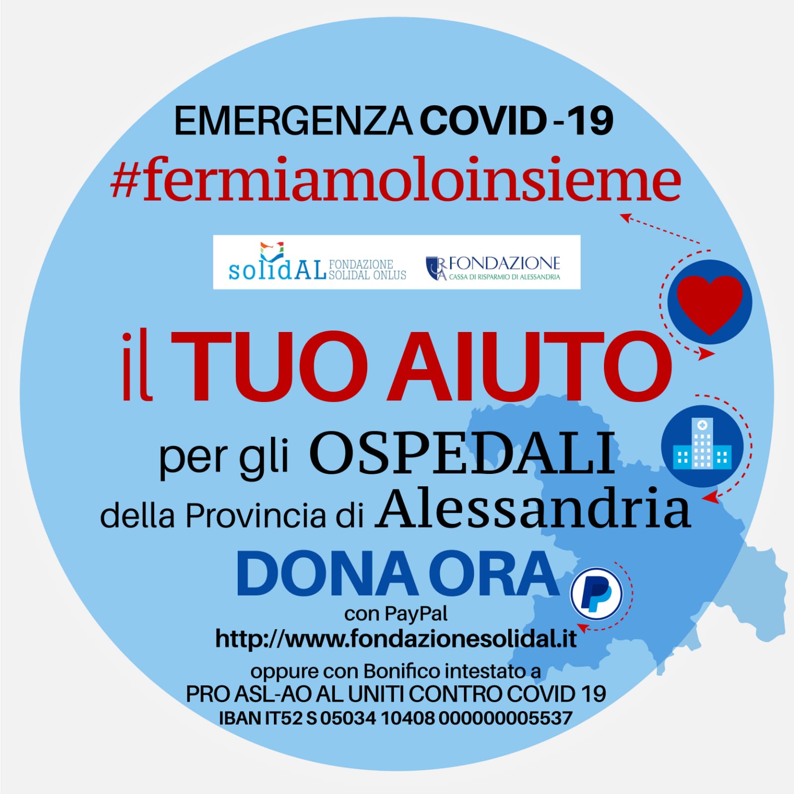 Campagna benefica per gli ospedali della Provincia di Alessandria: Le donazioni effettuate alla Fondazione SolidAL, che godono dei benefici fiscali, potranno essere fatte tramite un bonifico bancario (si consiglia di farlo on-line, per chi è in grado di farlo, e di non recarsi agli sportelli bancari) utilizzando l'iban IT52 S 05034 10408 000000005537 conto intestato a PRO ASL-AO AL UNITI CONTRO COVID-19 con causale Emergenza Covid Ospedali Provincia (chi lo desidera può indicare quale). Grazie a tutti!