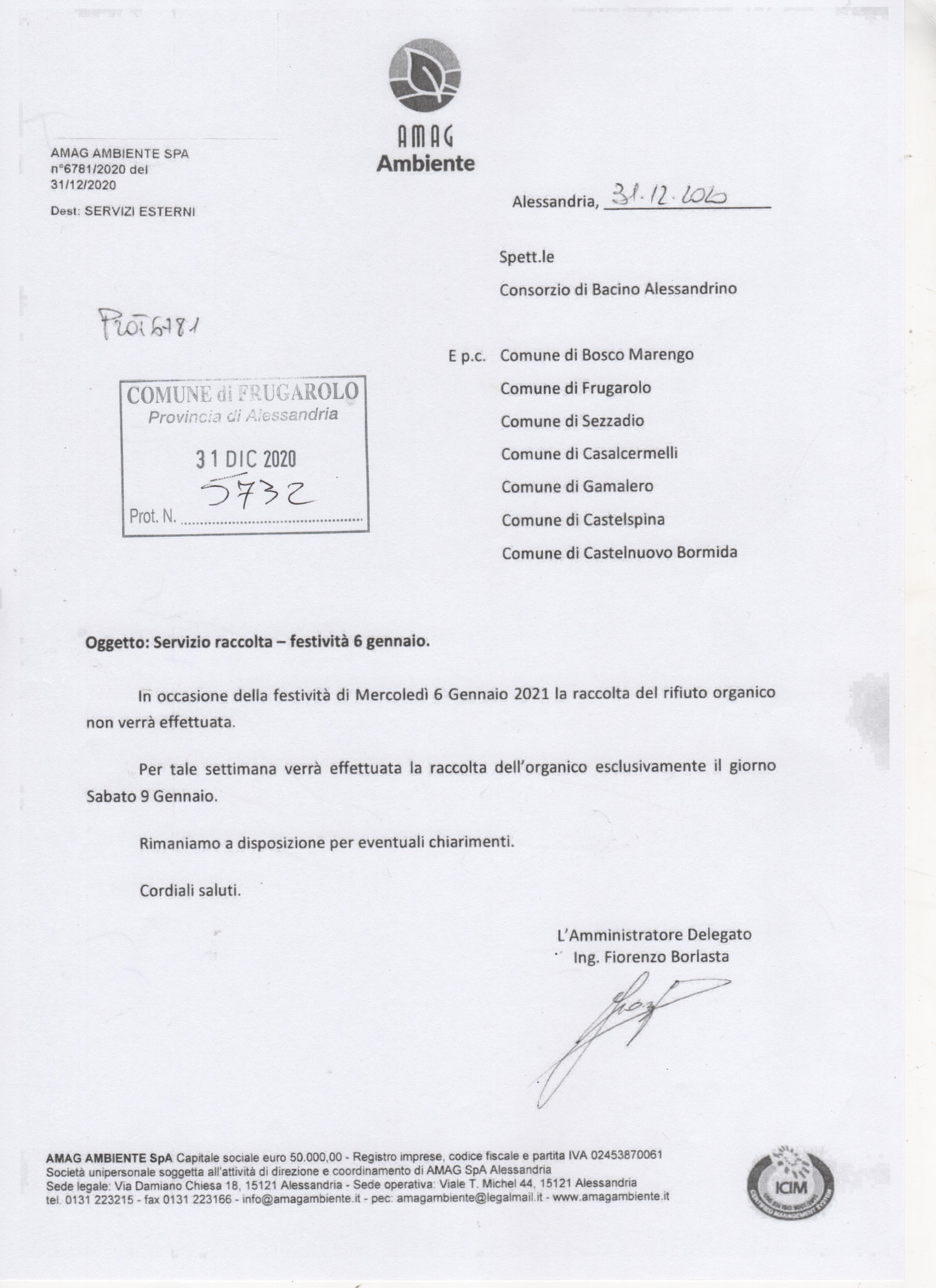 Il servizio di raccolta dei rifiuti organici previsto per il 06.01.2020 non verrà effettuato, come comunicato da AMAG Ambiente. La suddetta raccolta verrà posticipata a Sabato 9 Gennaio.
